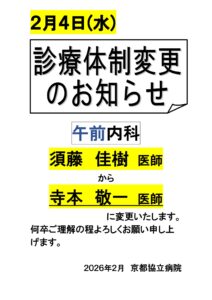 2026年2月4日(水)内科 休診・代診のお知らせ