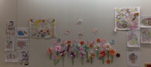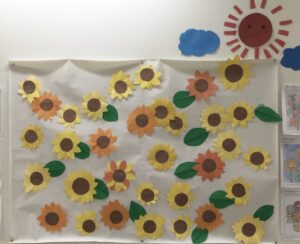 また、アサガオやひまわりの花を折り紙や画用紙で作成して飾りつけしました。