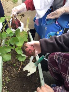 秋は、コスモスの花を作成して飾りつけしました。芋掘りも行いました。