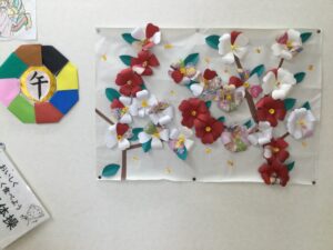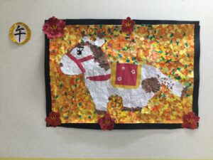 冬は、クリスマス飾り、年賀状づくり、新年には書き初めや今年の干支である馬のちぎり絵も作成しました。